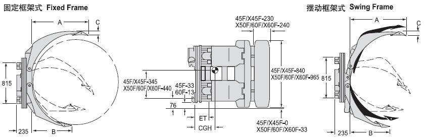 Capacity 承載能力(kg) Catalog Order NO 型號 Mounting Class 安裝等級 Mounting Angle安裝角度Long Arm Length長臂長A(mm)Roll Range紙卷直徑(mm)Short Arm Length短臂長B(mm)Long Arm Thickness長臂厚C(mm)Type類型 Weight 自重(kg) Effective 失載距ET(mm) Horizontal Center of Gravity 水平重心CGH(mm)